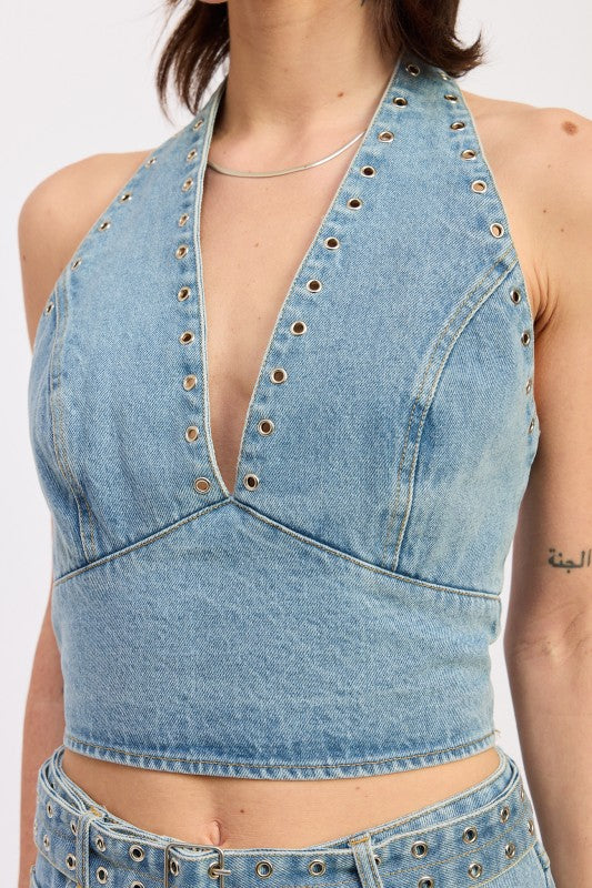 BACKLESS FRONT TIE HALTER TOP WITH LACE TRIM
