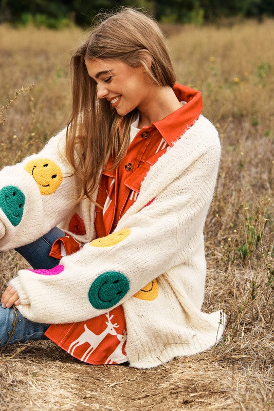 V NECK BUTTON FRONT APPLIQUE CARDIGAN