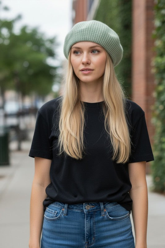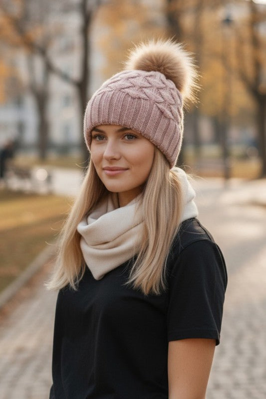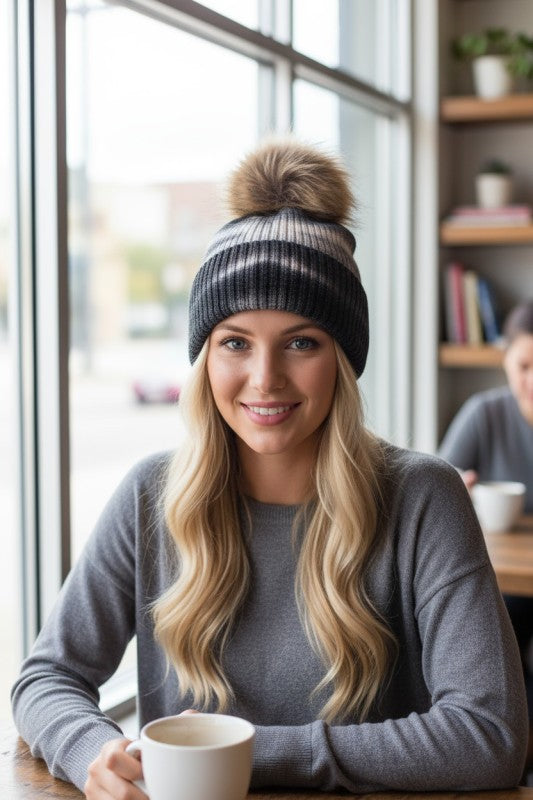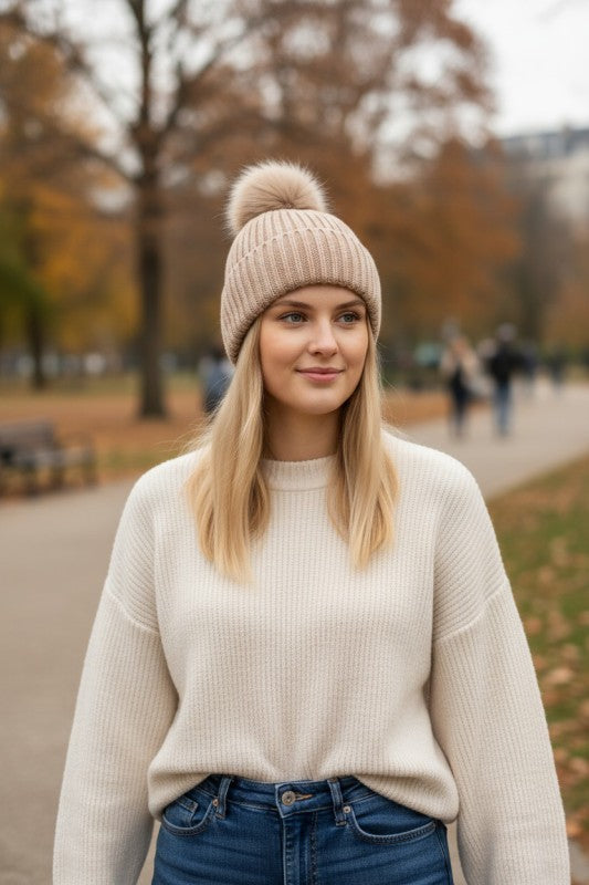 Large Genuine Fur PomPom Winter Cuff Beanie