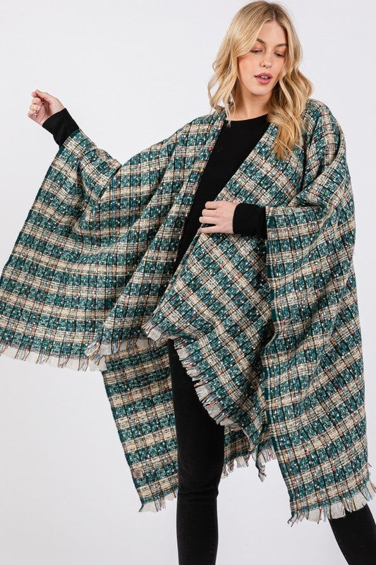 Oversize Plaid Raw Edge Ruana Cardigan