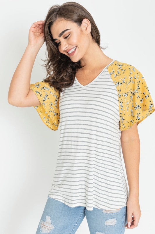 V Neck Stripe Floral Sleeve Tunic