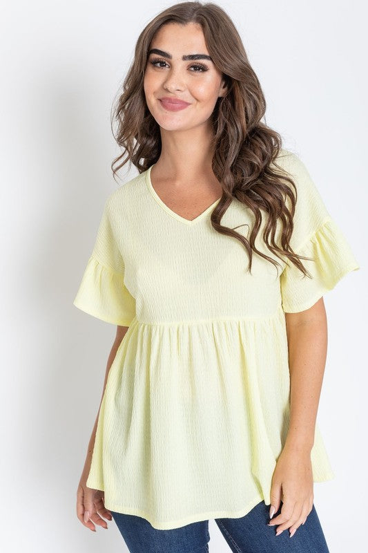 Shirred V Neck Ruffle Sleeve Baby Doll Tunic