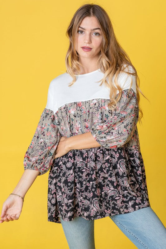 Three Tiered Bishop Sleeve Paisley Floral Tunic