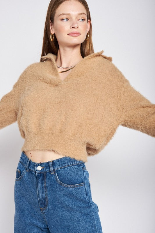 V NECK FUZZY CROPPED SWEATER