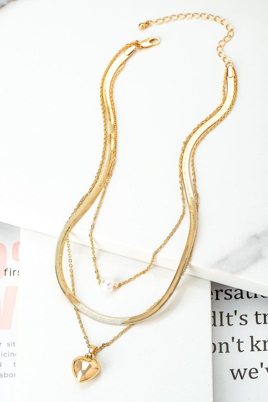 3 row herringbone chain pearl and puffy heart pendant necklace, featuring: