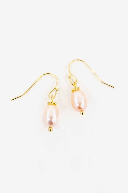 Beautiful pale pink pearls dangle from the gold hook earrings.