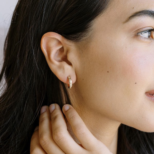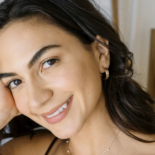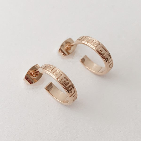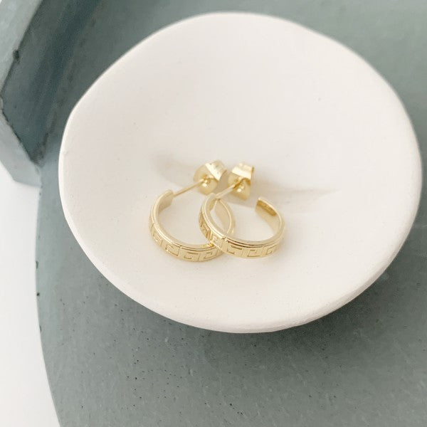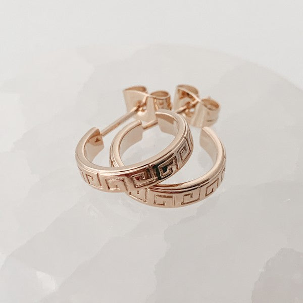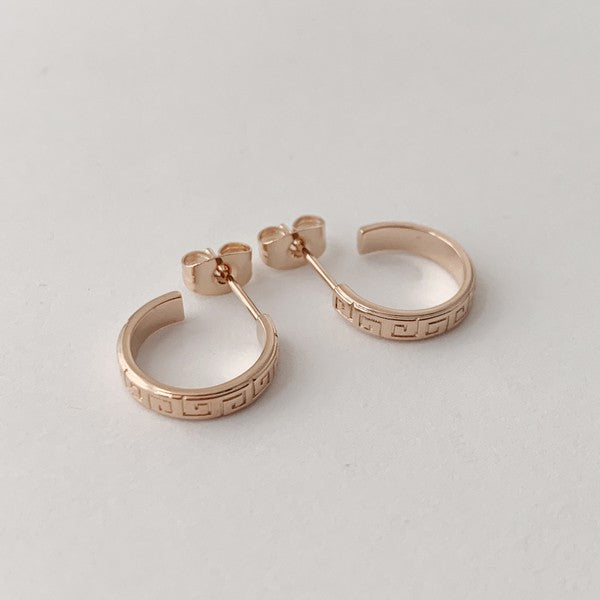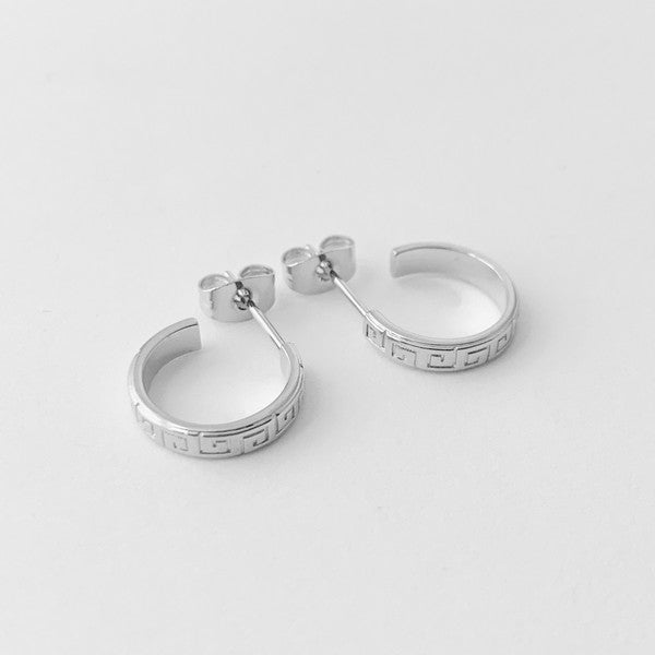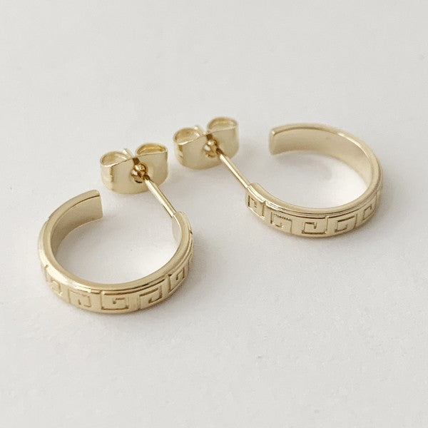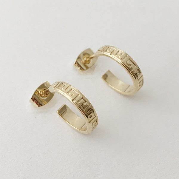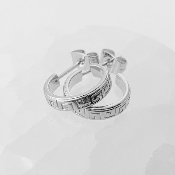 Bold hoops embossed with a statement making Greek Key pattern. Add these classically chic studs for instant style. Small measures 14mm, large measures 17mm.