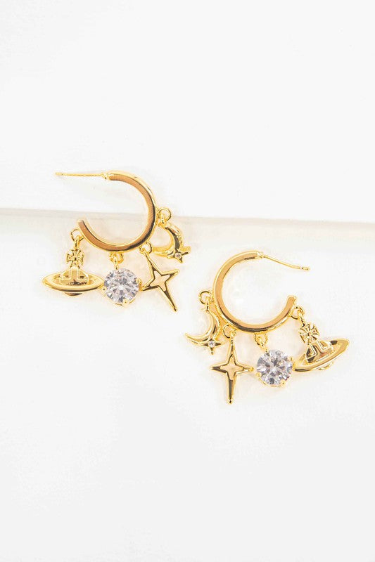 Gold hoops with cute charms of a crescent, star, stone, and planet.