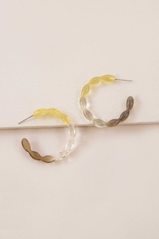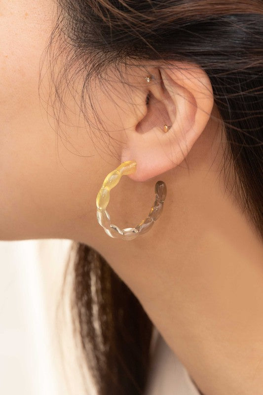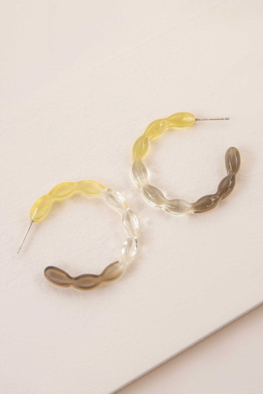 Three toned acrylic hoop earrings in yellow, clear and taupe.