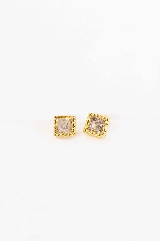 Mini gold square earrings with a small square stone in the center.