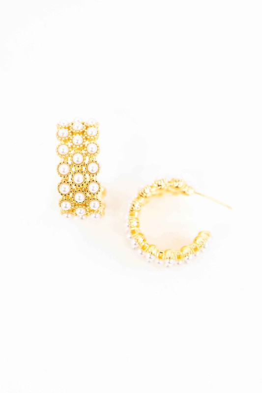 Gold statement hoop earrings with pearls lining the earring.