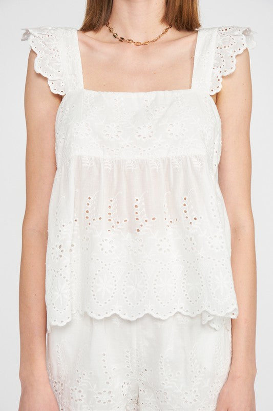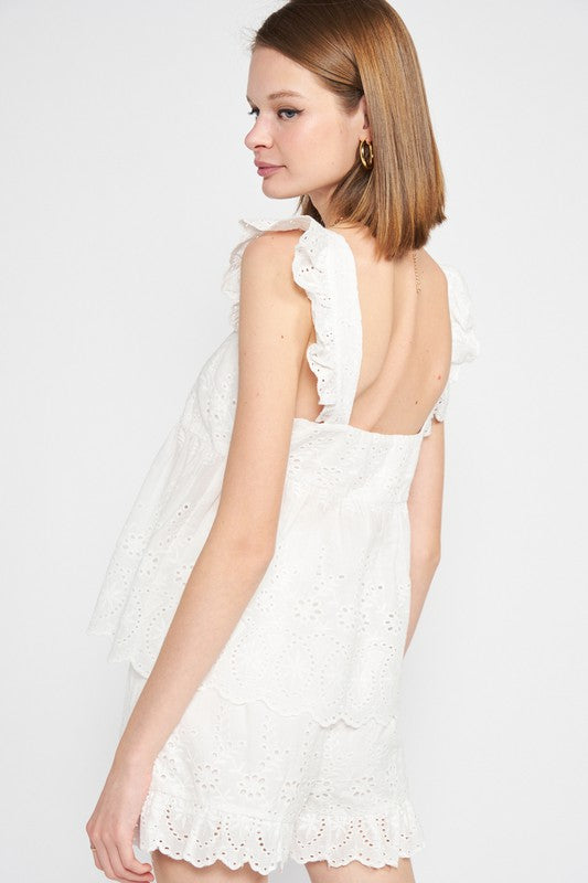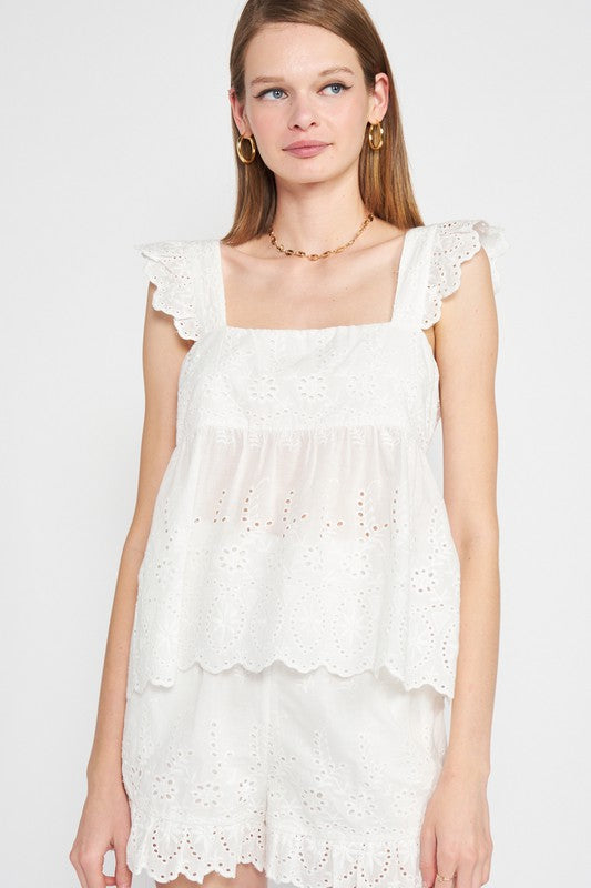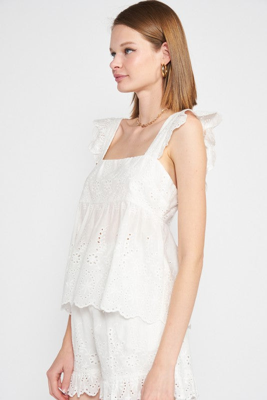 RUFFLE SLEEVE HEM EYELET TOP