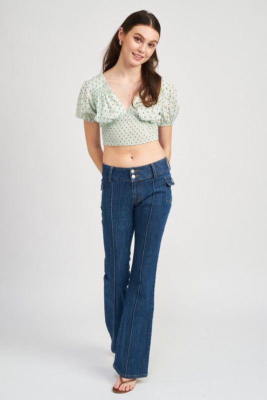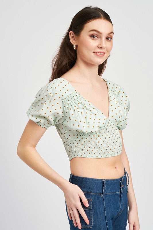 V NECK FLORAL CROP TOP WITH SMOCKING