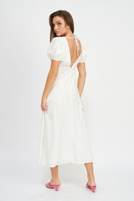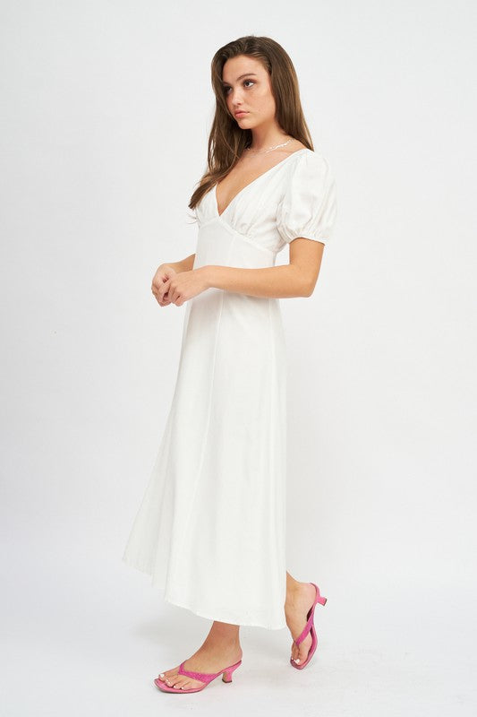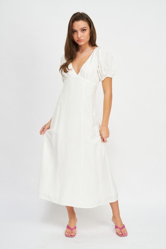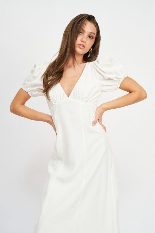 V NECK MAXI DRESS WITH PUFF SLEEVES