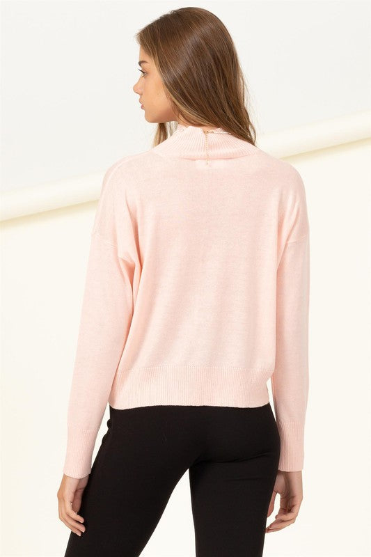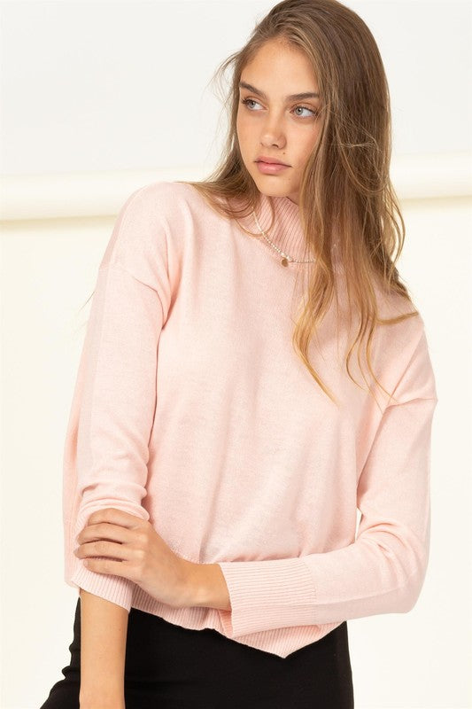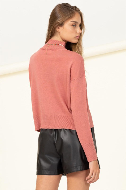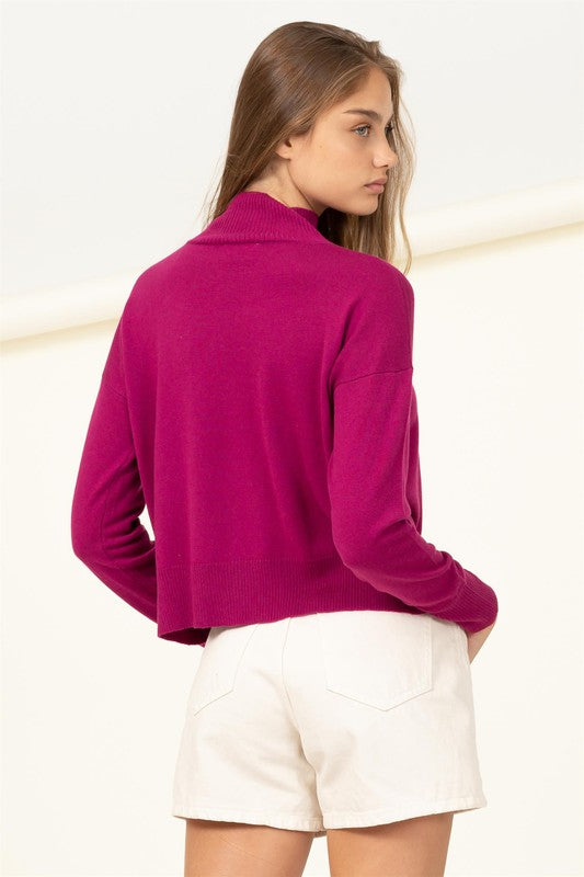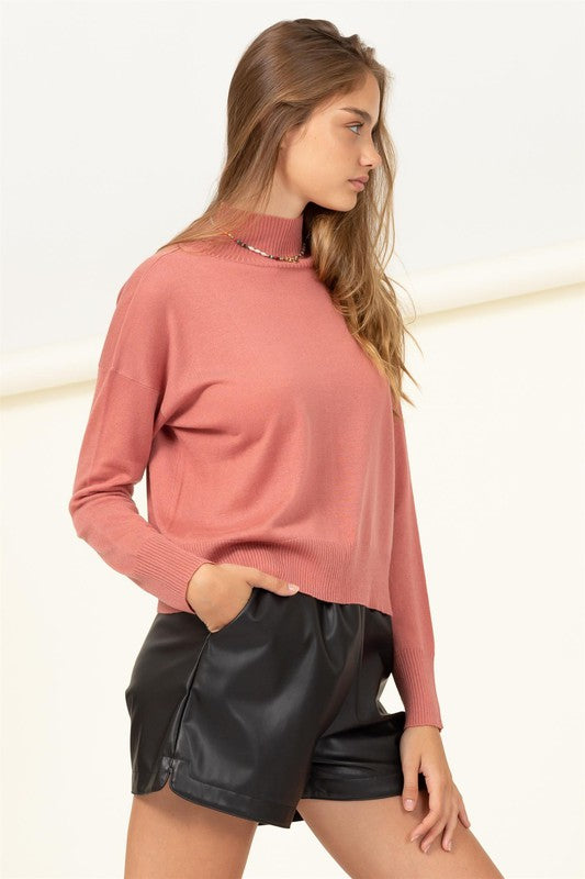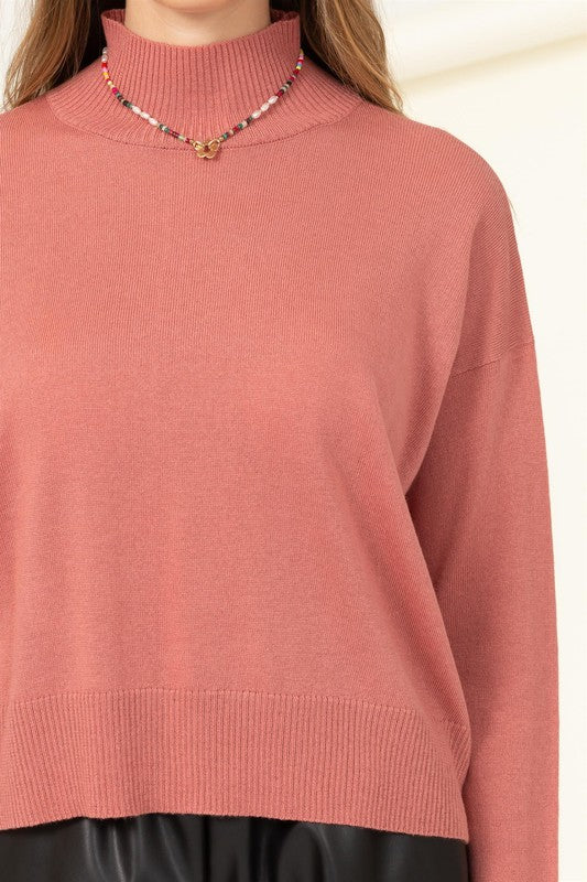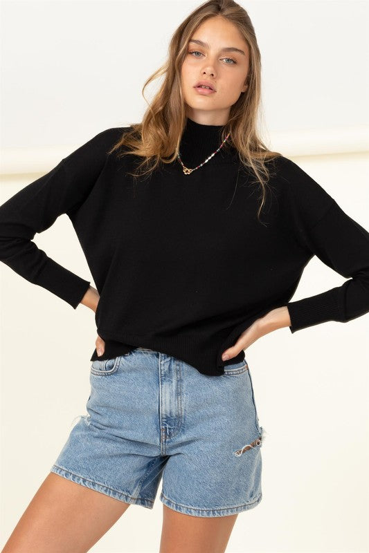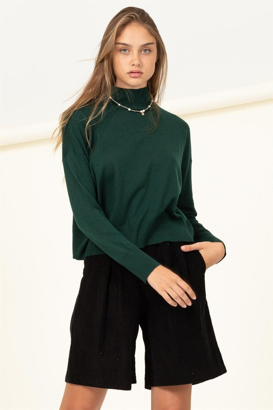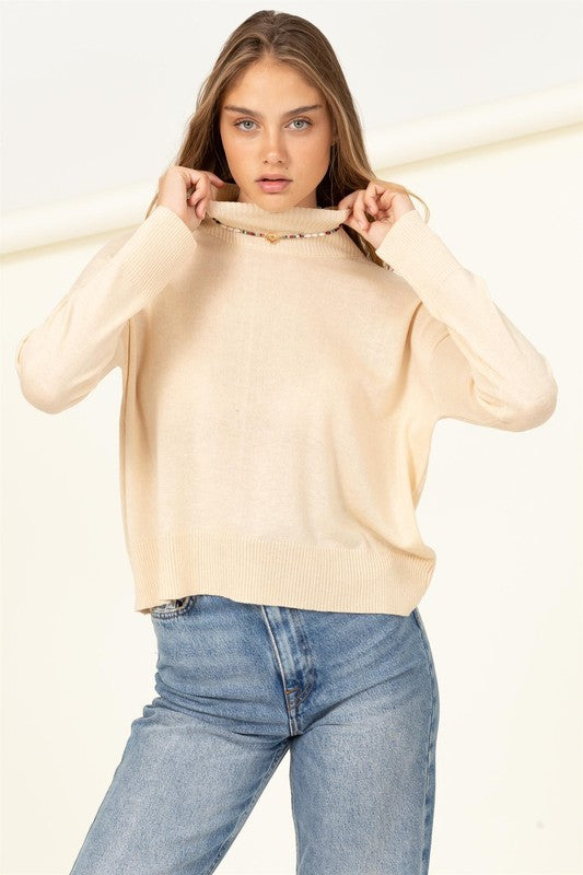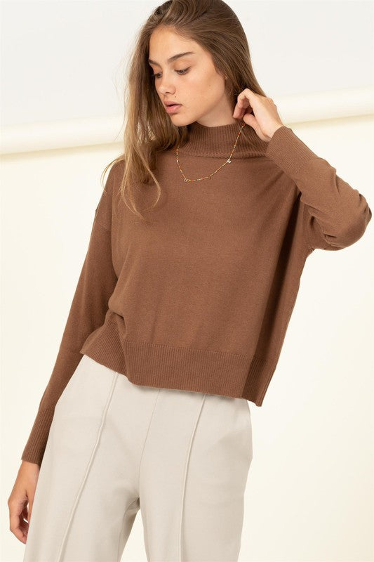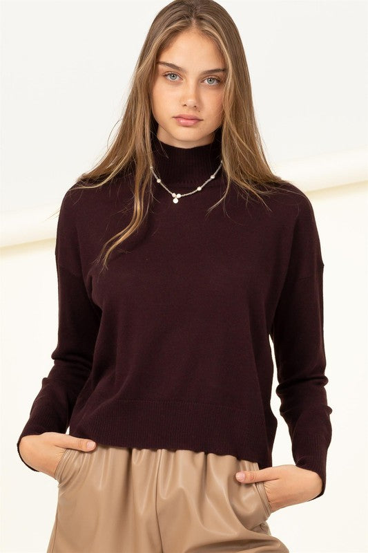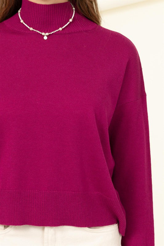 Embrace the cozy vibes and stay toasty in this versatile sweater. This must-have piece is designed with a slouchy high neckline that adds a touch of warmth and style to your outfit. The sweater features a pair of long, defined sleeves with drop shoulders, contributing to its relaxed and laid-back appeal. The wide-cut bodice is finished with a ribbed hem for added texture and visual interest.